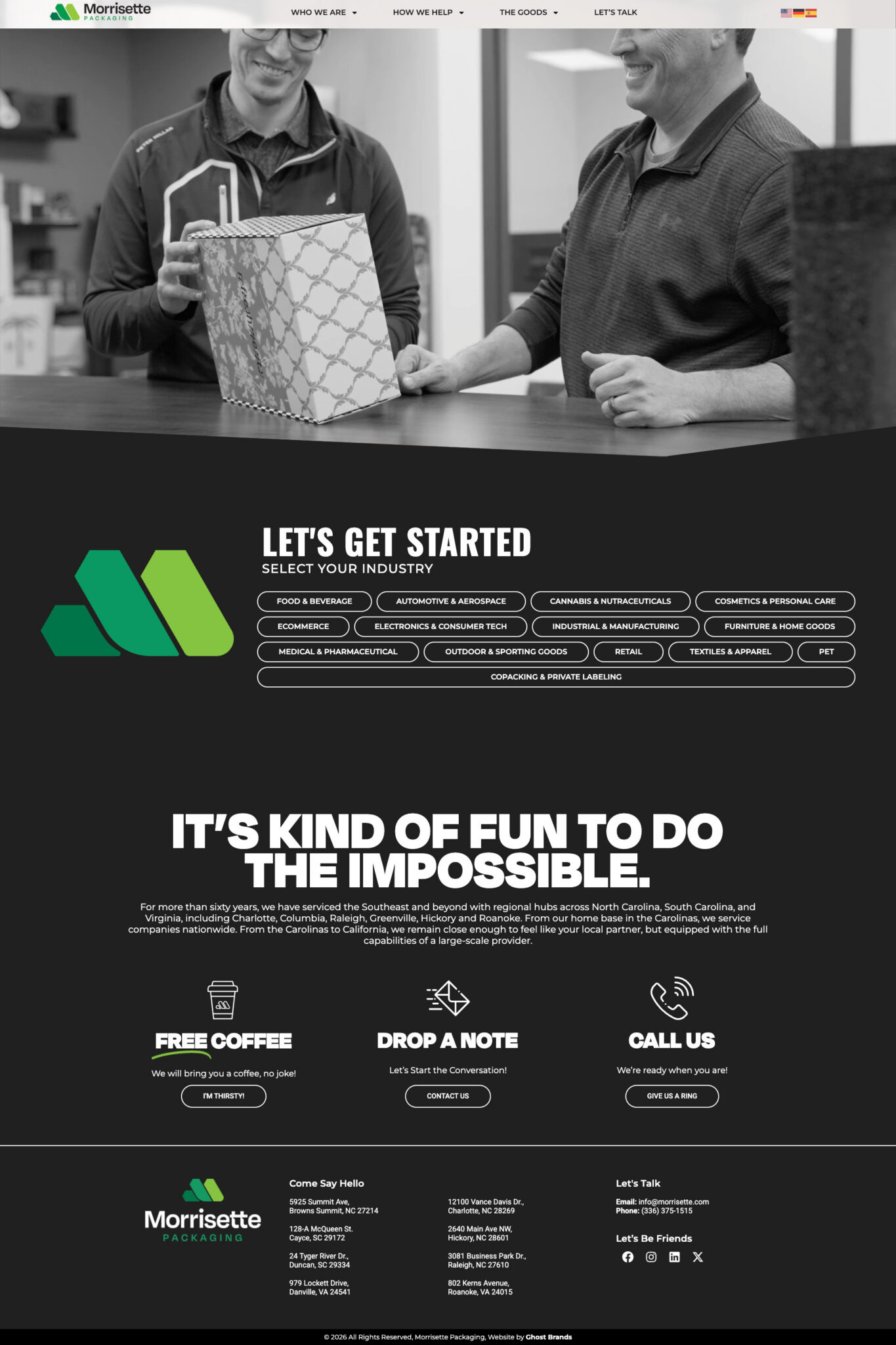Ghost Brands completely overhauled the Morrisette Packaging website with a focus on conversions, clarity, and long-term scalability. We rebuilt the site architecture to improve information sourcing, making it easier for buyers, partners, and prospective employees to navigate industries, capabilities, and solutions.
