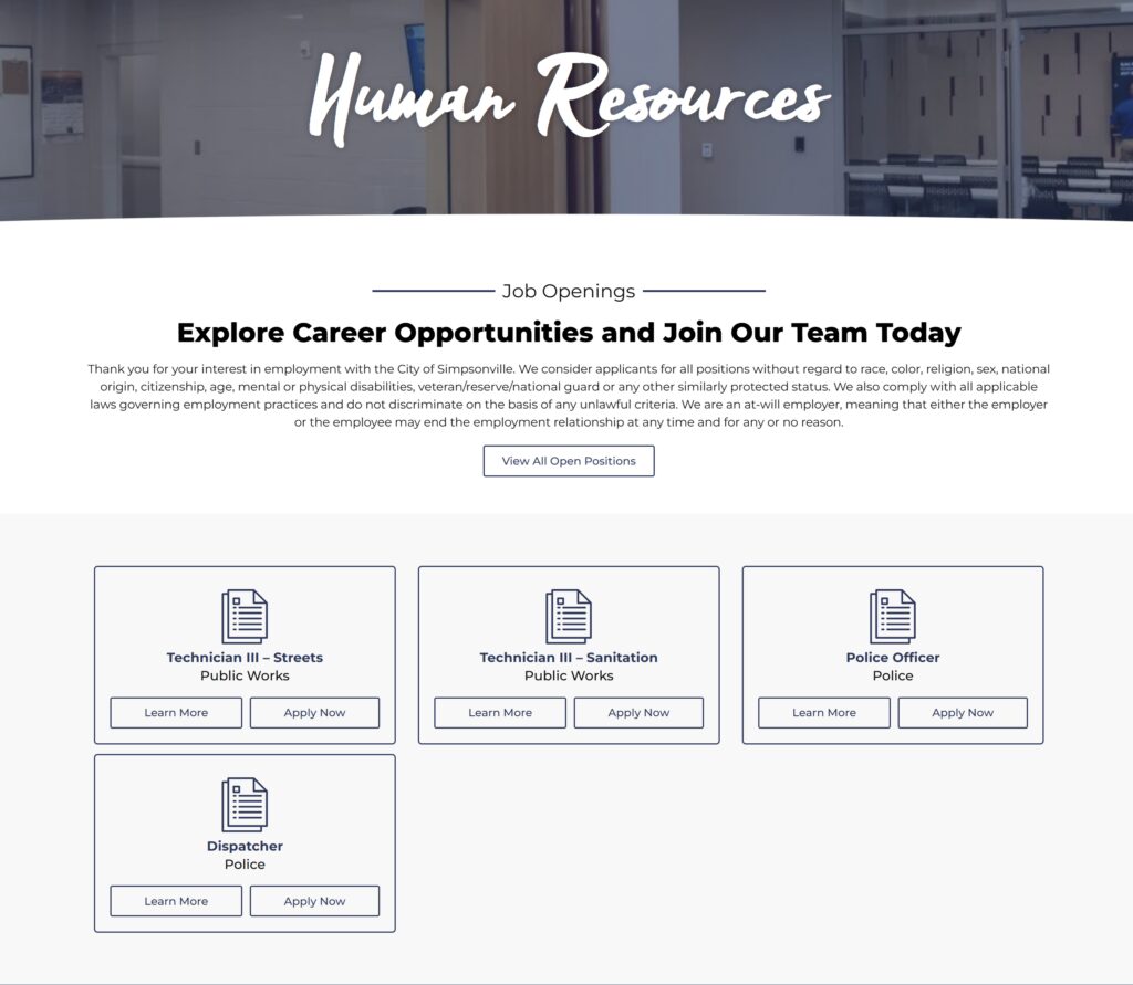 On-Going Campaigns: Following the website launch, we continue supporting departmental updates, capturing new content as the city expands, and maintaining official city minutes. Our ongoing partnership ensures the platform remains accurate, dynamic, and aligned with Simpsonville’s continued growth.