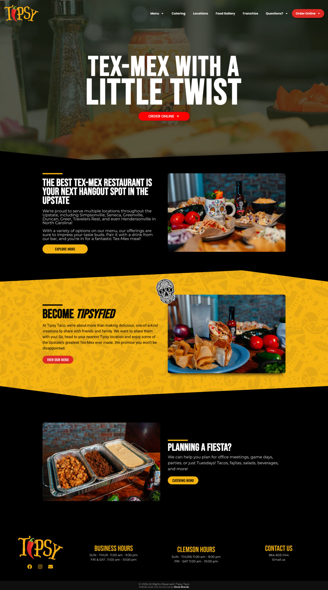 In rebuilding the Tipsy Taco website, Ghost Brands focused on creating a digital experience that felt as authentic and energetic as the brand itself. The design preserved the established personality of Tipsy Taco while modernizing the layout, messaging, and visual flow to better reflect its scratch-made kitchen and community-driven atmosphere.